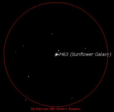 M63 (Canes Venatici): Chamada de “girassol” (provavelmente por lembrar as espirais formadas na disposição das sementes nessa flor), é localizável a partir da estrela alfa (Cor Caroli) da constelação Canes Venatici. Essa estrela tem magnitude 2.9 e está praticamente solitária numa ampla região do céu setentrional. Pode ser facilmente identificada a dez graus ao norte da constelação de Coma Berenices, no vértice de um triângulo isósceles invertido que tem como base as estrelas Denebola (beta Leonis) e Arcturus (alfa Bootes), conforme é mostrado na figura abaixo.
