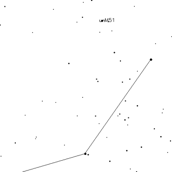 O mapa abaixo mostra a localização da M51, pode-se perceber o horizonte norte com o rabo da Ursa Maior como referência (repare a dupla Mizar/Alcor na parte inferior do esquema)